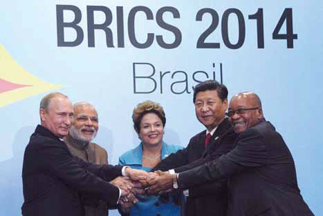 The leaders of the BRICS nations: Putin (Russia); Modi (India); Rousseff (Brazil); Xi