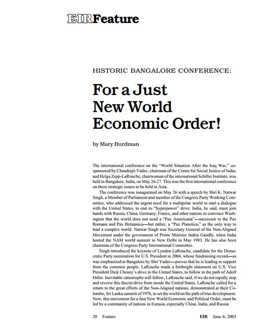In May 2003, Lyndon and Helga LaRouche return to India for the second time that year to participate in a major international conference co-hosted by the Schiller Institute and the Center for Social Justice of India. The conference is opened with a speech by Indian Member of Parliament Shri K. Natwar Singh, who was the Secretary General of the Non-Aligned Movement under the government of Prime Minister Indira Gandhi when India hosted the Non-Aligned Movement Summit in New Delhi in 1983. In his speech, Singh emphasizes the historic role of the Non-Aligned Movement as leading the fight for the New International Economic Order.