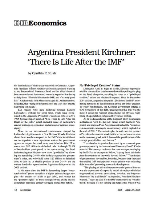 This speech, prepared in direct coordination with the Argentine president Nestor Kirchner, comes in the wake of Argentina's victory over the international vulture funds, forcing them to renegotiate Argentina's debt and accept a vast write-down of the face value of their claims against Argentina. Refusing to give into the threats and 'conditionalities' of the IMF, Argentine President Nestor Kirchner delivered a speech in April in which he declared: