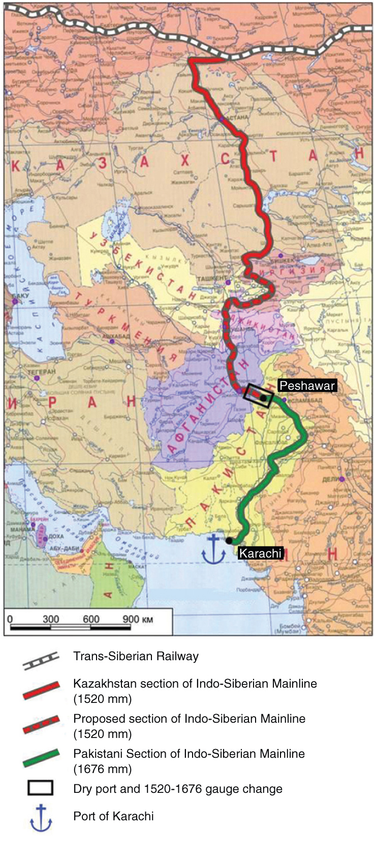 The Indo-Siberian Railway is a proposed north-south development corridor, running south from Omsk, Russia, on the Trans-Siberian Railway, through Kazakhstan, Kyrgyzstan, Tajikistan, Afghanistan, and Pakistan to the port of Karachi on the Arabian Sea. At an inland terminal (“dry port”) in Peshawar, Pakistan, there will be a gauge change from the Russian broad-gauge rails (1520 mm) to the even wider “Indian gauge” (1676 mm) used in Pakistan. The route intersects or parallels planned Chinese Silk Road Economic Belt railroads in both Central Asia and Pakistan. |