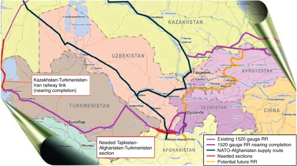 Tajikistan’s only international rail link today runs through Uzbekistan. A 160-km railroad section across far northern Afghanistan to Turkmenistan (Figure 6) will give Tajikistan other routes to the Eurasian rail grid, as well as access to the Caspian Sea. In March 2013, Tajikistan, Afghanistan, and Turkmenistan signed an agreement on building this railroad, including two 700-meter bridges.