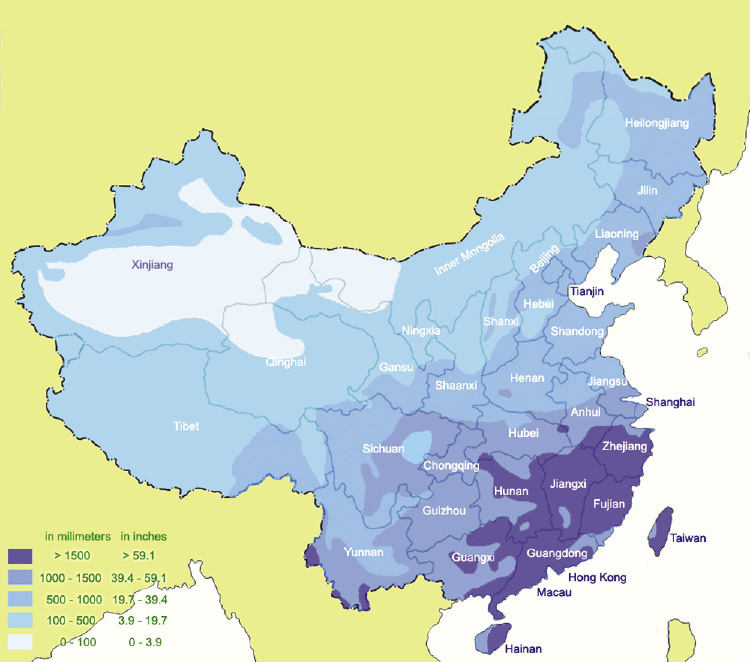 The far northwest of China is a continuation of the desert drylands from north Africa, across Arabia, thence spanning Southwest and Central Asia. This aridity pattern decreases eastward, as the monsoonal effect comes into play, to the point of very high rainfall in Southeast China. The great Yellow River (Huanghe) in Northern China, courses through drylands and loess formations, and in several places, its river bed is higher than the surrounding plains! The long Yangtze River, rising in the highlands of the Tibetan Plateau, has a large catchment area, with a sizable flow, emptying at Shanghai, into the sea.