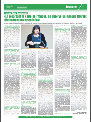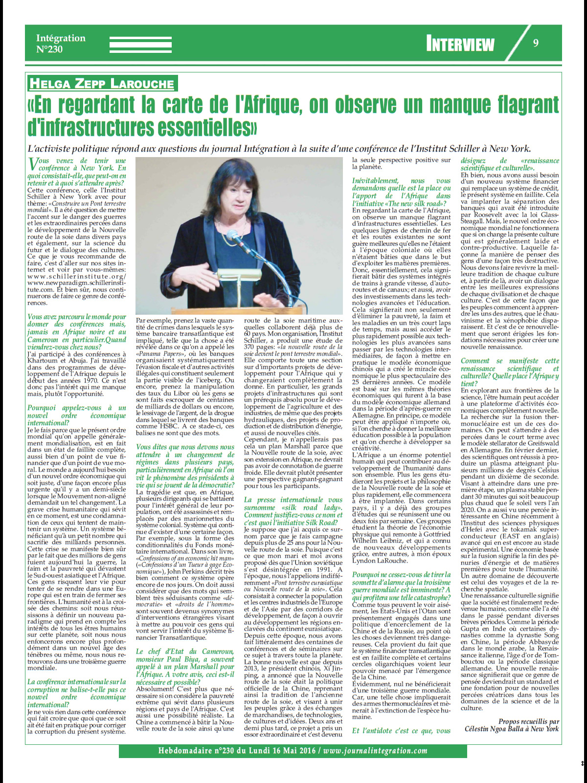 This interview of Schiller Institute founder Mrs. Helga Zepp-LaRouche was conducted for the weekly Cameroonian publication l'Intégration (www.journalintegration.com), on May 6, 2016 by its New York City correspondent Celestin Ngoa Balla, and was published in its May 16 issue. Below is a transcript of the interview.