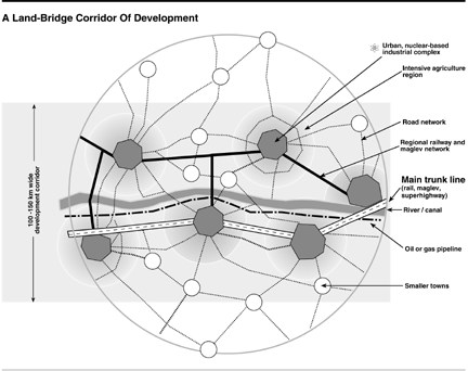 The totality of the corridors, with their numerous branches, forms a unified network, providing the foundation for the development of a gigantic economic area of about 4 billion human beings. Over the last three years, in the area of these five main corridors, numerous large-scale transport, energy, and water projects have been launched; numerous additional ones are planned. The infrastructural development of Eurasia is like a gigantic locomotive picking up steam: It moved slowly at the beginning, but has accumulated such momentum, that nothing could stop itshort of the outbreak of large-scale socio-political chaos and war.