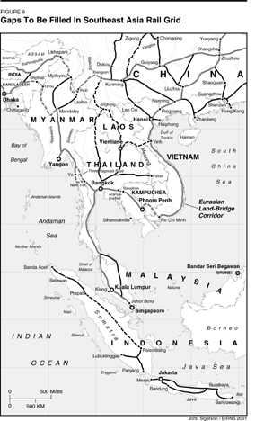 In addition, there is the key project of creating a continuous connection from Singapore to southern China: the much-discussed Singapore-Myanmar-Kunming Railroad (SMKR). By decision of the ASEAN heads of state, and government a feasibility study is being carried out. This was to be presented to the ASEAN governments in mid-2001, and an announced decision in favor of the projects is expected. The probable route: Singapore-Kuala Lumpur-Bangkok-Three Pagodas Pass-Ye-Yangon-Lashio-Ruili-Kunming.