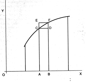 Consider Figure 5, a case of determining the limit of a function that will correspond to the area under this curve. [18] Take the area of rectangle ABCD: It is smaller than the surface ABCF. On the other hand, rectangle ABEF is a little larger. If you could find the perfect mean between the two, you would become the new Archimedes of modem times. But, you can determine only some approximation.