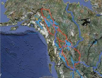 We would have seen, then, to support the NAWAPA project, by 1968, the completion of the Alaska-Canada rail system (see Figure 3), shown here in red. There is no rail connecting Alaska and southern British Columbia. That would have begun then, and would have supported the logistical needs for the construction of the large northern reservoirs throughout the NAWAPA project, which you can see there in blue. And at the same time, in 1968, we would have seen NAWAPA begin construction, after a few years of engineering.