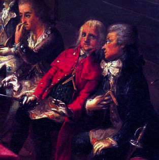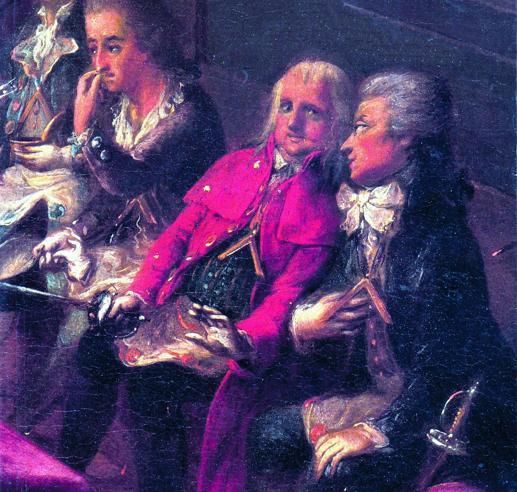 This detail from a larger painting by was in the private collection of the Austrian Tinti estate. Mozart’s original quartet partners for his groundbreaking “Haydn” Quartets included Haydn himself, along with the von Tinti brothers, fellow lodge members. In the complete painting, there are 35 men, most with swords, none pointed at anybody—except for the sword at Mozart’s back (at the far right). The man whose sword points at Mozart was a police infiltrator, one Leopold Aloys Hoffman, probably employed by the head of the secret police, Count Anton Pergen. In 1792, Hoffman composed a pamphlet attacking the “Magic Flute.” The von Tintis, in commissioning the painting, evidently wished to leave an account for posterity.