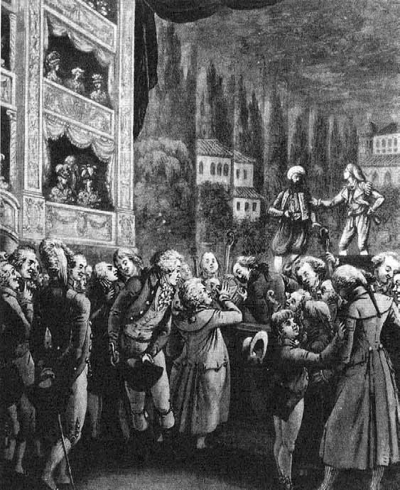 Wikimedia Commons Mozart (center) attends a performance of his opera “Die Entführung aus dem Serail” (“The Abduction from the Seraglio”) in Berlin in 1789: a provocative musical creation, and a polemic aganst the war against the Turks. |