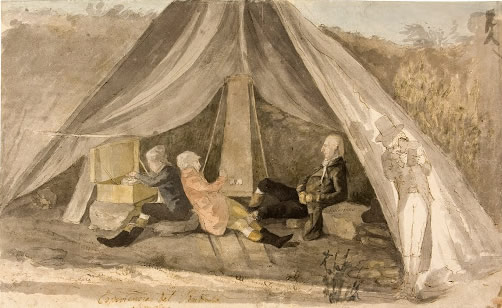 Juan Ravenet watercolor of Malaspina & Bustamante's gravity experiment in Malvinas Island around 1791.