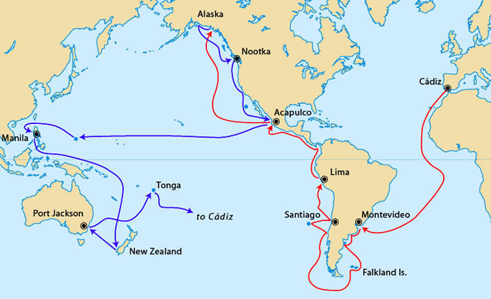 Perhaps the most successful expedition was that of Alesandro Malaspina (1754-1810), an Italian navigator in service to the Spanish Navy. He charted the entire Atlantic coastline of South American, and then went north on the Pacific side, charting the coastline all the way up to near Anchorage, Alaska. He studied Pacific trade winds and ocean currents and discovered important trade routes (some were so important that they were kept as national secrets in order to protect against British and Dutch pirates). He charted the coastline of the Philippines, and large parts of Australia and New Zealand. The expedition did experiments using gravity to help demonstrate the spherical shape of Earth, and made astronomical observations. Malaspina brought back so many detailed maps that he caused a boom in the cartography industry that lasted many years. The expedition returned with 14,000 plant specimens, 500 animal specimens, and 900 illustrations.