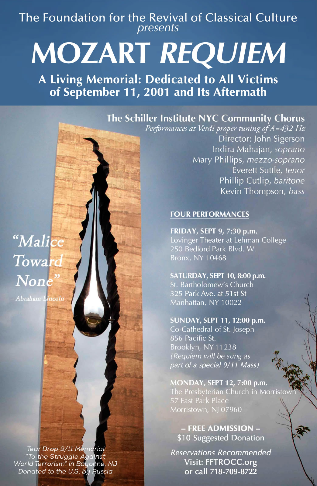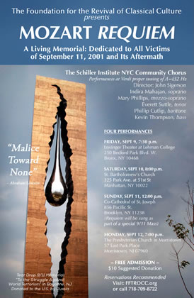 At precisely this time of urgent need for immediate political action, the leadership of the Lyndon LaRouche movement, which is located in Manhattan, is preparing for what LaRouche had called for, a “living memorial” to the victims of 9-11,— the direct victims and their families first and foremost, but also the United States and every part of the world which has been victimized by the crime and its coverup. The center of that “living memorial” will be performances of Mozart’s Requiem, in which a great creator celebrates, not death, but the eternity of life and its mission in the face of death, through and beyond the centuries.