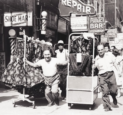 Men pulling racks of clothing on a sidewalk in the New York Garment District in 1955. |