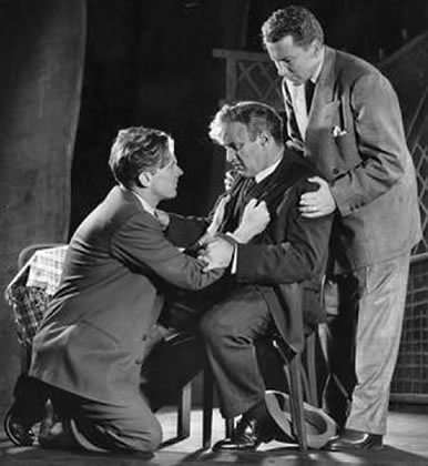 Lee J. Cobb, seated, with Arthur Kennedy, left, and Cameron Mitchell in the 1949 production of Death of a Salesman. |
