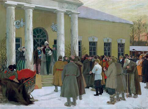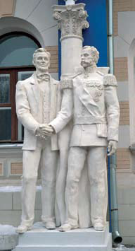 In February 2011, the Russian government held an exhibition in Moscow commemorating the collaboration between President Lincoln (“the Emancipator”) and Tsar Alexander II (“the Liberator”). The statue is a modern work by A.N. Burganov (the two leaders never actually met). The painting shows serfs listening to a reading of the Tsar’s proclamation giving them their freedom, 1861, from a 1907 original by B.M. Kustodiev. |