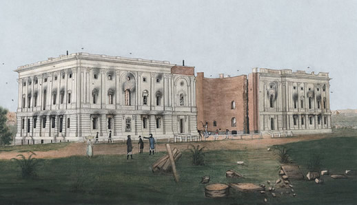 A British force then descended along Pennsylvania Avenue to the President’s House (as the White House was then called). After imbibing on the vintage wine and consuming the meal which had been prepared for the President and his party prior to their hasty departure in the face of the rapid British advance, they set it ablaze as well. The White House, also sturdily constructed from the same materials as the Capital, continued to stand although, with the appearance of a burned-out hulk. Even General Ross’ aide, William Smith, was flabbergasted at the wanton destruction, noting that the British “burnt its Capitol and other buildings with the ruthless firebrand of the Red Savages of the woods.”