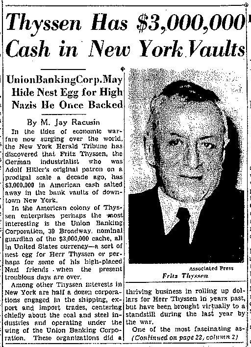 A partial clarification appeared in the New York press eight years later, the result of some digging by Herald Tribune investigative reporter M. Jay Racusin. A front page article (“Thyssen Has $3,000,000 Cash in New York Vaults,” July 31, 1941) stated that “Fritz Thyssen, the German industrialist who was Adolf Hitler’s original patron” had for many years had millions of dollars “salted away” in the Union Banking Corporation in downtown New York, a sub-unit of the world’s largest investment banking firm, Brown Brothers Harriman. Racusin had gotten a copy of a letter written by a Brown Brothers Harriman representative to the New York state banking authorities, asking whether the firm’s partners – Prescott Bush and three others -- should resign from the board of Union Banking since the United States might soon enter the war then raging in Europe. After breaking this story, Racusin was nominated for a Pulitzer prize that year.