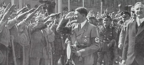 ![]() Adolph Hitler returns the salute. Far right: Hitler's finance minister Hjalmar Schacht.