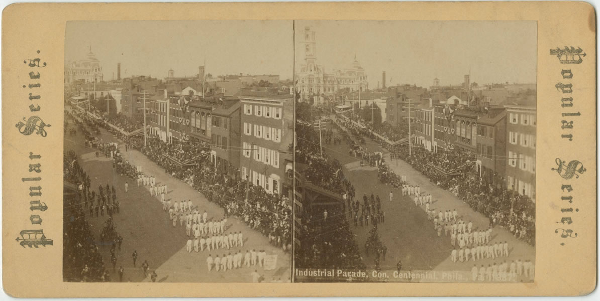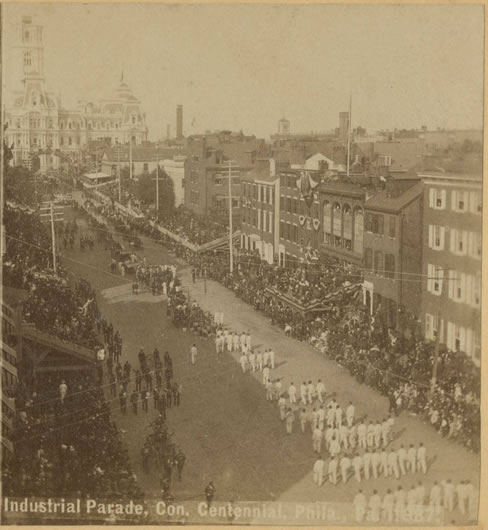View showing the civic and industrial parade on South Broad Street marching toward City Hall. The procession represented industrial progress from 1787 to 1887. Shows spectators crowding the sidewalks and sitting on bleachers lining the street. Procession includes: a group of marching men in black hats, white pants, and white shirts; floats; a marching band; and firemen. City Hall is visible in the background.. |