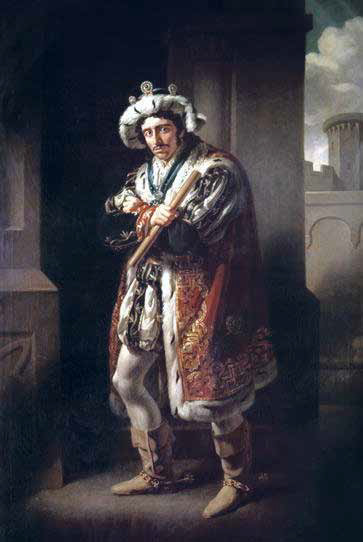 ![]() Richard III as played by Edward Kean, painting by John James Halls (1814). |