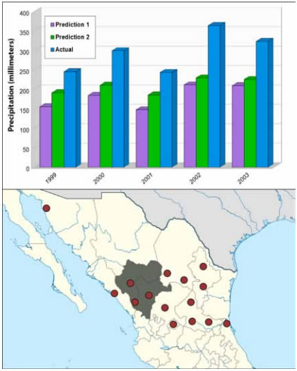 Chart (top) comparing the actual rainfall (blue) to the predicted amount without ELAT (ELectrification of the ATmosphere) stations (red circles), in the state of Durango, Mexico (shaded gray) [2] [3] [4] |