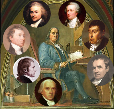 ![]() Benjamin Franklin (center) and the leaders of the revolutionary youth movement inspired by him (from the top, left to right): John Quincy Adams, Alexander Hamilton, the Marquis de Lafayette, Mathew Carey, James Madison, John Marshall and James Monroe. |