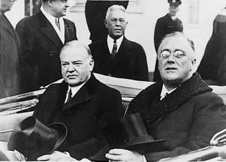 Outgoing President Herbert Hoover (left), with Franklin D. Roosevelt, March 4, 1933. Hoover had tried to use the RFC to bail out the banking system. But his policy was a disaster, since instead of extending credit to build infrastructure and create jobs, he slashed expenditures, declaring, on May 5, 1931, that a balanced Federal budget “was the most essential factor to economic recovery.” |