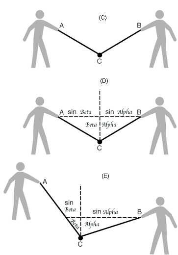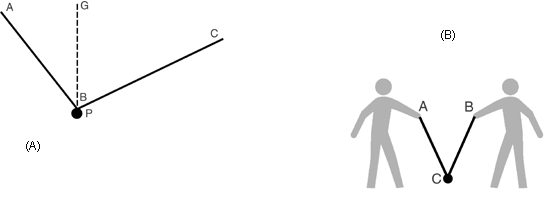 | In 4(a) the relationship of the force exerted at A to the force exerted at C is proportional to the sine of angle ABG to the sine of angle CBG. The following demonstration illustrates this principle intuitively. Have two people hold a weight suspended by two strings as depicted in 4(b). It will take a certain amount of effort on the part of both people to lift the weight vertically. Now, have the two people gradually step back from each other, while continuing to hold the weight up at the same height as depicted in 4(c). The effort required to hold up the weight increases as the distance between the people increases. The rate at which this effort increases is proportional to the sines of the angles the strings make with a vertical line drawn through the weight. 4(d). Try experimenting with different angles and notice how the effort required to hold the weight up changes. For example, if person A holds his end of the rope higher, thereby changing the angles, the effort both he and the person at B have to exert to hold up the weight also changes. 4(e) |