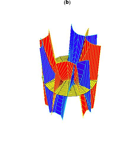 (b) combines the surfaces based on the variations of the sine and cosine for the third power.