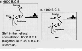 Sphaerics, or astronomy, dominated the architecture, religion, and economy of ancient Egypt, especially the magnificent Old Kingdom (2700-2180 B.C.E.), which built the Great Pyramid of Khufu as an astronomical observatory. Located on the Giza plateau, the Great Pyramid is stunning in the precision of its construction, a construction which could only have been meant for astronomical study. It is located precisely at 30° latitude, and is more accurately aligned to the four cardinal points than modern structures built to the same end. Within that alignment, the shafts built into the Pyramid, at crucial angles, allow for precise observations of key stars, such as Sirius, the North Star, and Orion's brightest star, as they transit the celestial meridian. For the builders of the Great Pyramid to have accomplished such a task, the understanding of the regular motions of the stars and the celestial geometry of sphaerics had to have existed long before such an undertaking. The Pyramid Texts carved on the smaller pyramids of Saqqara, describe important astronomical cycles as myths in which, for example, figures such as Osiris and Isis are represented by the constellation Orion and the star Sirius, respectively. And, while carved in stone during the Old Kingdom, the origin of the Pyramid Texts is presumed to be much older. Susan Kokinda Box II Precession of the Eqinoxes