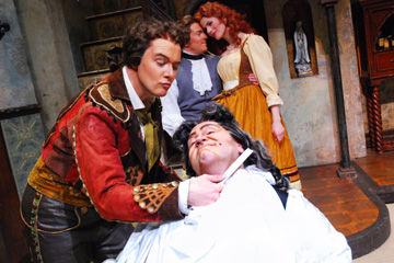 ![]() Photo/Anne M. Peterson The Virginia Opera’s production of “The Barber of Seville,” with left to right: Jason Detwiler as Figaro, Steven Condy as Dr. Bartolo, and in the background, John Zuckerman as Count Almaviva and Manon Strauss Evrard as Rosina. |
