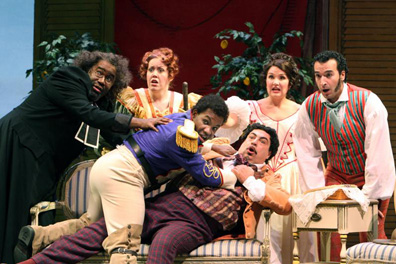 ![]() WNO/Karin Cooper The WNO cast of the Barber of Seville (from left to right) Eric Owens, Cynthia Hanna, Lawrence Brownlee, Donato DiStefano, Sylvia Tro Santafe, and Simone Alberghini. |