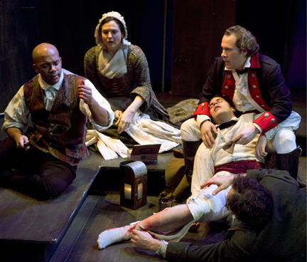 ![]() Photo by James Culp for The Acting Company The playwrights only possible improvement upon the novel was the treatment of the only African-American, Caesar, (played by William Sturdivant) who is seen here extracting a bullet from the leg of his master (played by Sonny Valicenti). However, this scene never took place in Coopers novel. Also shown are Georgia Cohen and Andy Grotelueschen. |