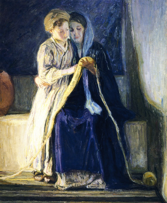 There is a long tradition of tender paintings of the Madonna and Child in Western art; Tanner adopted the subject to present another domestic scene of education. His "religious" painting is not from any particular Biblical story, but is rather a very everyday type of human activity, and he even used his wife, Jessie, and his son, Jesse (at age 8 or 9) as models. Tanner demonstrates his considerable compositional skills, while he is less rigorous in showing depth. Tanner was effective in bringing his characters to life using light. He often used thin, almost translucent layers of paint over thicker layers to give the illusion that light originates from inside the painting, since light could penetrate several layers into the painting before being reflected back to the viewer.