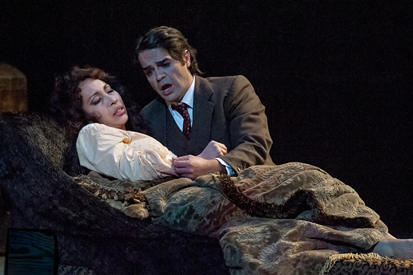 The MOT performance of Verdi’s La Traviata on November 16th 2013 was largely successful, with the exception of the unnecessary addition to Verdi’s staging of Violetta romping in the bedroom during the overture. But for the most part, the voices were excellent and Maestro Vordoni maintained a balance that allowed for nearly flawless transparency of the dialogue between voice and orchestra, which has not been the case in some previous MOT performances. The music, the subdued elegance of the set, and the costumes presented all the elements necessary to focus the audience’s imagination on the true subject (subtext) of the unfolding drama, without distraction. Of special note is the presentation by Stephen Powell, baritone, of the transformation of Germont, from a staunch defender of oligarchic tradition with a cold shoulder of moral indifference, to a man capable of compassion.
