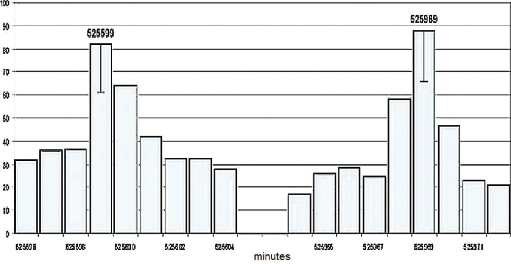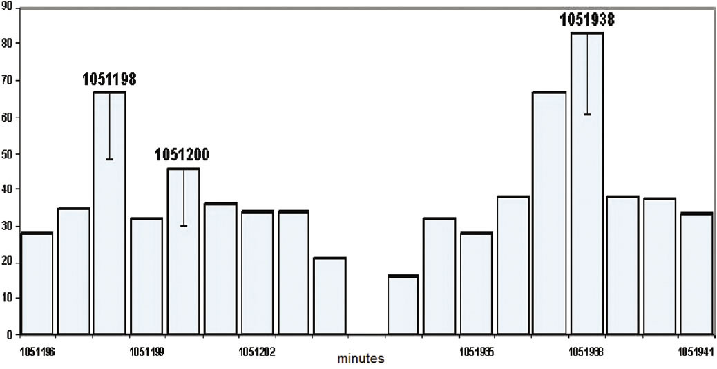 Shnoll refined his histogram intervals to minutes rather than hours, as shown in Figure 9, and compared them (he took one-second counts of decay, and made histograms of 60 different counts, amounting to one minute). When he did this, his 24-hour peak clearly separated into two peaks: one at 24 hours (1440 minutes) and one four minutes earlier (1436 minutes), exactly corresponding to the time it takes any particular place on Earth to come back to the same star (or seen inversely, for a star to come back to the same place in the sky).