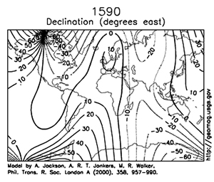 For example, imagine you had a compass needle that could spin freely in three dimensions; at the north magnetic pole, the needle would point straight down to the Earth (90° inclination), but as you moved south, the inclination would gradually change until it pointed parallel with the surface of the Earth at the magnetic equator (0° inclination). Even though the GMF is much more complex than a simple uniform dipole field, these three values can be measured at every location in the GMF.[4]