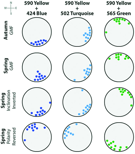 FIGURE 7 ![]() Birds’ orientation to monochromatic colors combined with a very lowintensity oscillating magnetic field. Image adapted from Roswitha Wiltschko, Katrin Stapput, Peter Thalau, and Wolfgang Wiltschko, “Directional orientation of birds by the magnetic field under different light conditions,” R. J. Soc. Interface (2010) 7, pp. S163-177. |