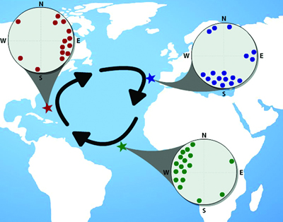 This ability to use magnetic conditions as “magnetic markers” or “magnetic signposts,” is not limited to birds. Juvenile loggerhead sea turtles from Florida show an interesting characteristic during the first years of their lives: They travel about the Atlantic Ocean, but always stay within the particular region known as the Atlantic gyre. So, hatchling turtles of this grouping were tested to see whether this ability depended upon magnetoreception. As in the cases of birds and lobsters, the turtles were kept in a single location, but were provided with three different artificial magnetic environments, simulating the magnetic conditions of three locations on the edge of the gyre. In each of the cases, the hatchling turtles oriented in the proper direction that would keep them within the gyre, had they actually been at the geographic locations that the simulated magnetic conditions indicated. As hatchlings, they obviously had never experienced the extent of the Atlantic gyre, so, in addition to the ability to navigate by magnetic conditions, they were seemingly born with some form of magnetic map of the Atlantic Ocean (Figure 4).