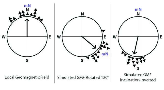 If an artificial simulation of the local GMF was created, simulating all the same conditions of the GMF (only in terms of the three components discussed above), but rotated 120° to the east, then the birds showed that they wanted to go in that corresponding roughly southeast direction (Figure 2b). Initially, it seemed that the birds were determining their direction by a desire to head towards magnetic north, as they following the 120° shift.