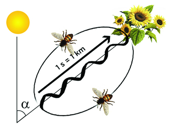 Animals have been found to operate based on a similar principle, though, of course, they do not use crystals as supplemental instruments. The capability to distinguish polarized light by some birds, insects,[3] and a few sea creatures, is more developed than our own. Early in this study, the polarization sense was surmised to be used by bees, which can additionally sense the Earth’s magnetic field, and are known to dance based on gravitational cues, and the position of the Sun.[4] The Sun sense and the polarization sense were found to be closely related. The bees’ dance, based on knowing the location of the Sun, is used to give directions to other bees, to indicate where a distant food source may lie, and they have been found to use this dance when a food source is 100 or more meters away from the hive. In this dance, the Sun’s position is the key reference point. This dance is called the “waggle waggle dance” (by humans, of course).