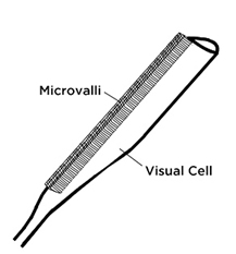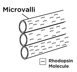 The cephalopods seem to share a relatively unique capability to respond to, and to reflect, patterns of polarized light. Cephalopods, with only one kind of squid as an exception, are colorblind, but their eyes serve them well, through an enhanced ability to selectively perceive linearly polarized light. The cephalopod eye has photoreceptors and corresponding hair-like microvilli which expand their surface area, and appear to be oriented orthogonally to adjacent ones, as seen in Figure 1b.