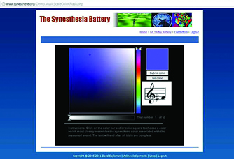 www.synesthete.org This screenshot displays one of a battery of online tests that someone can take to determine whether or not they are synesthetic. In this particular test, a color palette is provided for a person to match with a given tone. |