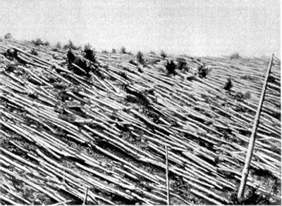 On June 30, 1908, a mysterious object—producing the same anomalous sounds as heard from meteors—detonated, felling trees in a 40 km radius, in Siberia. From its effects, the energy released in the blast is believed to have been several orders of magnitude greater than the atomic bomb dropped on Hiroshima. Unusual growth patterns have been observed near the blast epicenter, and along the observed flight path of the object. Shown: The “Tunguska event,” which flattened a Siberian forest. |