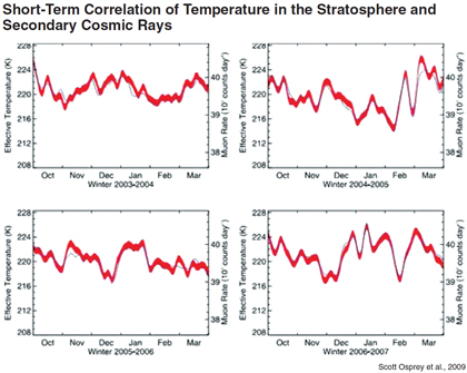Figure 14: Here we have another independent indication of this process. These are a little bit hard to see, because the correlation is so good. You see a very clear correlation between the variations in temperature, up in the stratosphere, and variations in cosmic ray flux.