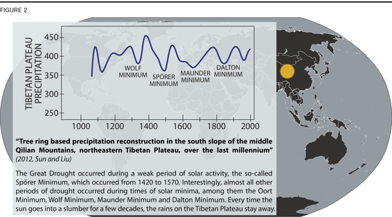 So, we see over the past 10 centuries, the past 1,000 years, here in particular, variations in precipitation, the amount of rainfall on the Tibet Plateau in China, corresponding directly with periods when you get very low solar activity, and high galactic influence. And when you get this high galactic influence, in this particular region, you get lower precipitation; you get drought. And you see that consistently across these minimums, these periods when the Sun got really weak, that allowed the galaxy to have a stronger role in the system. And, corresponding with that, we see variations in rainfall, precipitation, and periods of drought corresponding to this increased galactic influence.