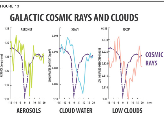 And then we also see a decrease in low-level cloud cover generally, the third graphic there, another confirmation, indicating this relationship between cosmic ray flux and cloud formation. That condensation of water vapor, the formation of aerosols, the amount of water condensing on these aerosols is an expression of this cosmic environment, so to speak.