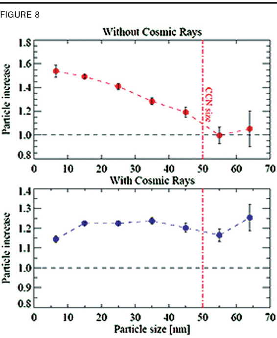 So again, go back to the earlier graphic (Figure 3) I showed, of the cosmic ray flux and the cloud cover changing, in direct relationship to each other. This was an experiment demonstrating some of the underlying physics of that: that when you get an increased ionization effect, you get the formation of the constituent parts of clouds. You accelerate the ability for clouds to form, by creating these little aerosols, and particles that grow to become the basis for the formation of cloud droplets. They show experimentally: On the top, you see, without the effect of cosmic rays, the size—the horizontal scale is the size of the particles, the aerosols. So, without the role of cosmic rays, you see the number of them declining, as the size grows. They're not growing to the size where they can be the basis for cloud formation.