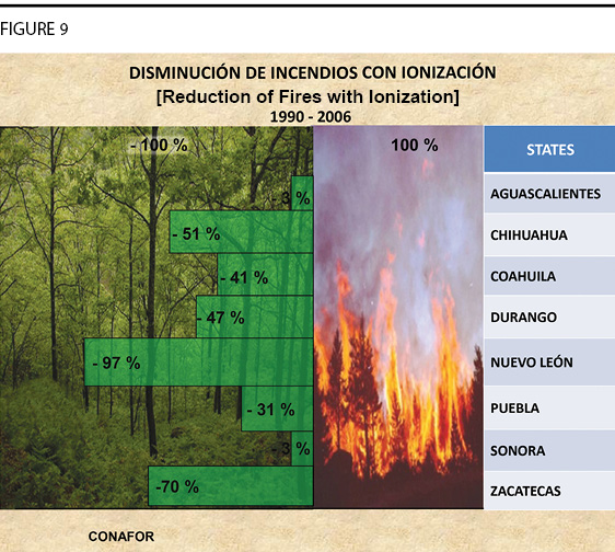 They’ve also been used to reduce forest fires. By increasing the precipitation in certain very dry regions, you can reduce the number of forest fires—those that get started, you can weaken them; you can prevent them from ever occurring. So here (Figure 9) we see indication of—again, under the effect of these stations, against some historical average of the number of forest fires in the area, the forest fires occurring in these states, you see it reduced, during the time period when they had these systems operational.7 On average, you had traditionally a certain number of fires occurring in each of these regions, and they were able to utilize these systems down there, to get a reduction in the number of forest fires.