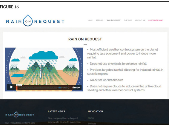 The Oman trials are ongoing. They’re still working on it in Israel. This is another company called Rain on Request (Figure 16)—good name—which is offering their technology to people in the United States.13 They’re campaigning, they’re lobbying, to get state governments, counties, businesses, to get support to develop the technology in the United States. There are other companies that are currently pursuing the potential to develop this technology in Asia. Other companies are pursuing active interest in South America, in developing new implementations of these systems, related technologies.